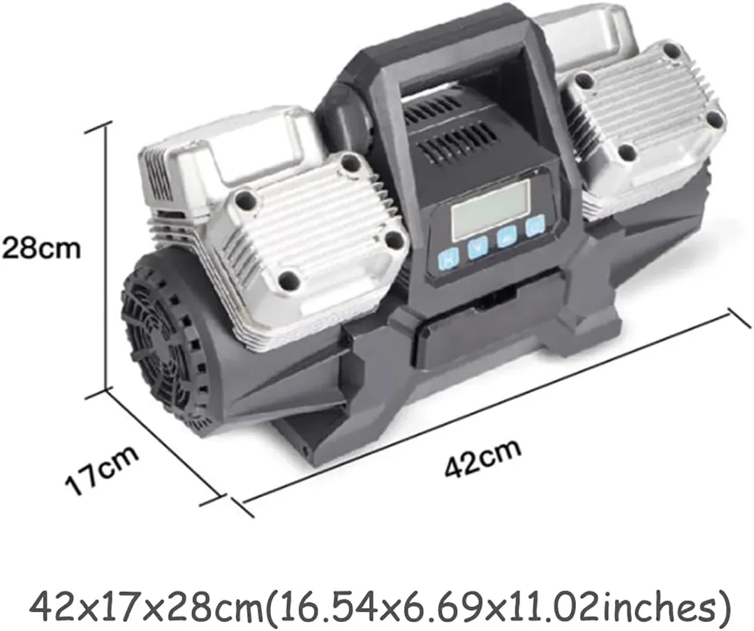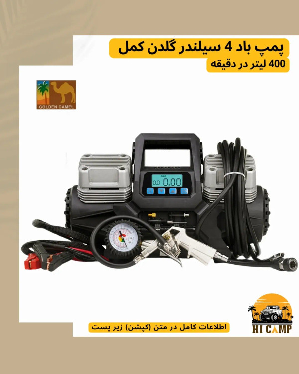 پمپ باد ۴ سیلندر گلدن کمل با پیستون فلزی مناسب آفرودبازها، رانندگان SUV، و اهل سفر و کمپینگ. با حداکثر فشار ۱۵۰ PSI و دبی هوا ۴۰۰ لیتر در دقیقه. ابعاد دستگاه ۴۳×۱۷×۲۸ سانتیمتر و وزن ۱۱.۵ کیلوگرم.
