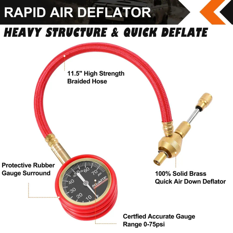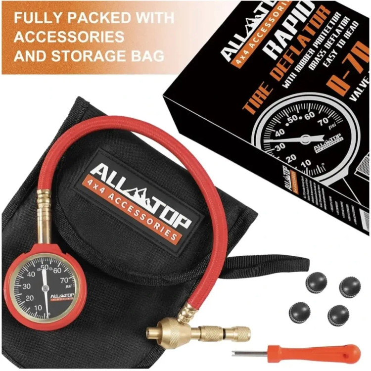 این ابزار یک دفیلاتور (تخلیهکننده سریع هوا) برای لاستیکهای خودرو است که با گیج فشار طراحی شده تا به آسانی فشار لاستیک را تنظیم یا کاهش دهد. محصول برای آفرودرها و طبیعتگردها بسیار مناسب است. ویژگیهای اصلی: مکانیزم تخلیه و تنظیم سریع هوا با دقت بالا، ساختار مقاوم از جنس برنج، گیج دقیق با محدوده 075 PSI، شلنگ تقویت شده و بافته شده 11.5 اینچی، محافظ لاستیکی ضدضربه جهت محافظت از گیج.